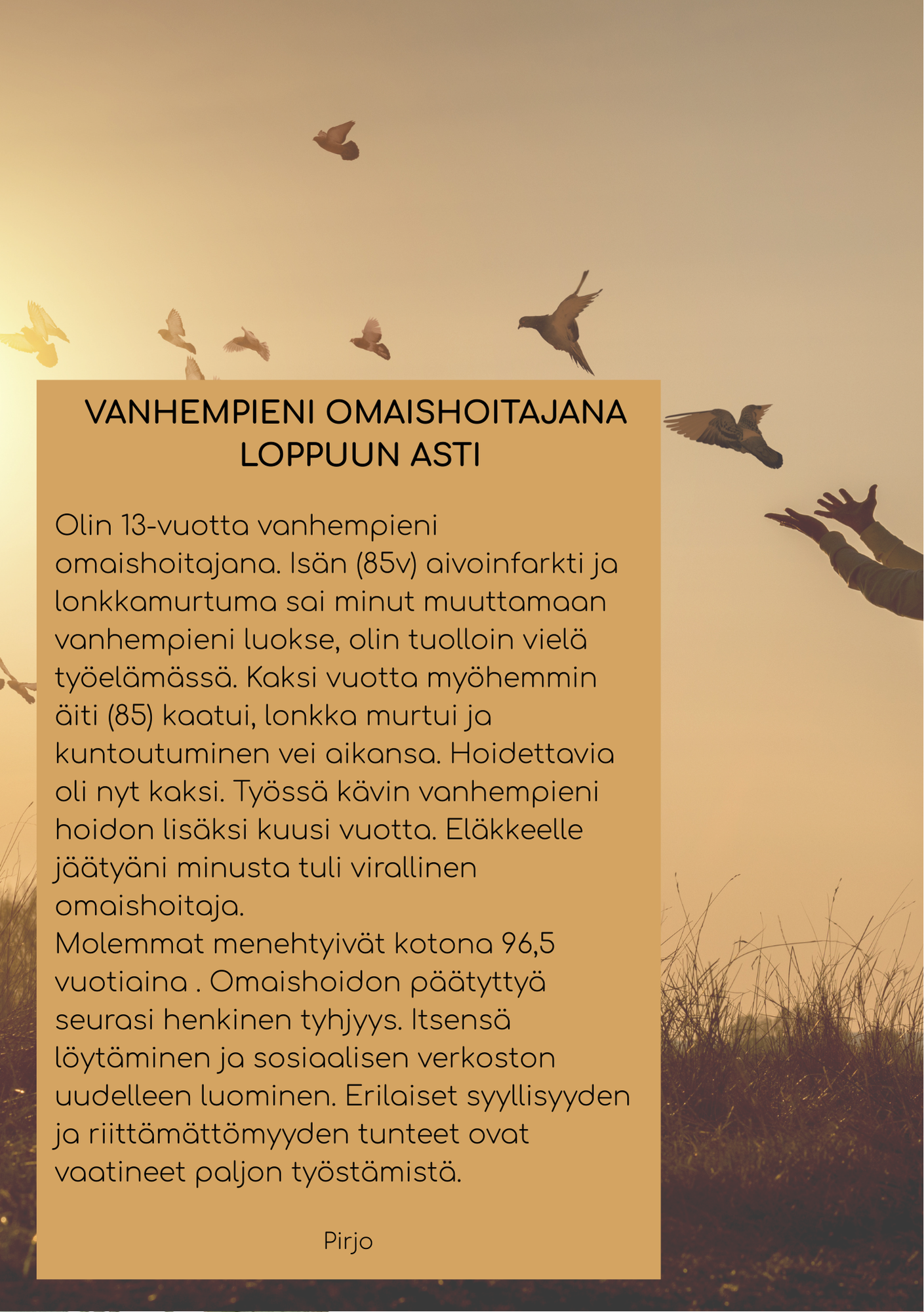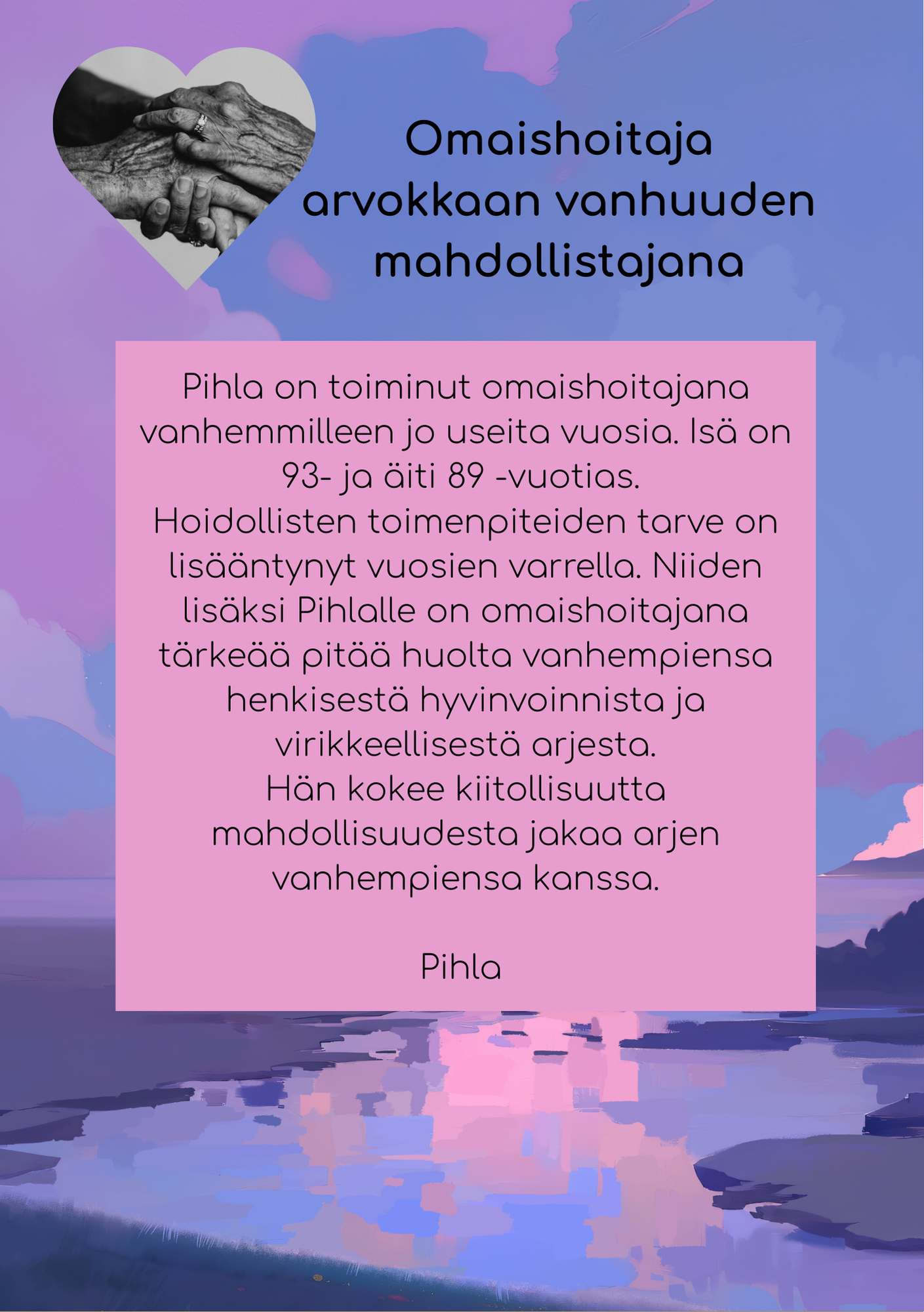 Koulutettuja omaishoidon kokemusasiantuntijoitamme voi tilata pitämään puheenvuoron, alustuksen tai vierailemaan erilaisiin tilaisuuksiin. Alla "kirjan takakannet" joissa heidän kokemansa lyhyesti. Lisäämme näitä sitä mukaan kun niitä valmistuu. Kysy lisätietoja tai pyydä kokemusasiantuntija omaan tilaisuuteesi ottamalla yhteyttä yhteydenotto@msol.fi tai täyttämällä sivuvalikosta löytyvä lomake.